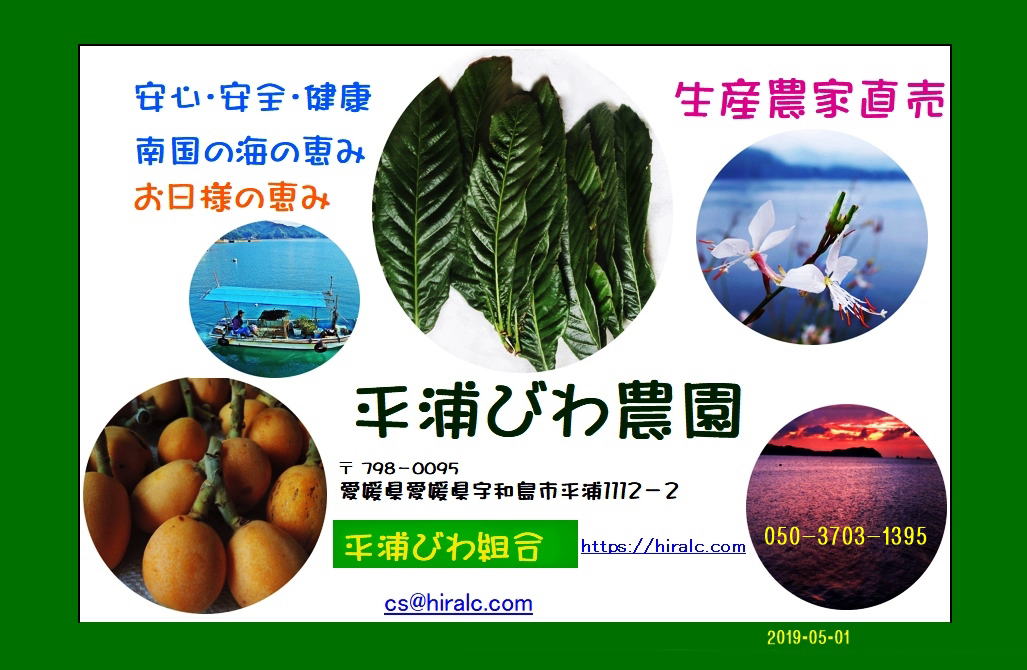 平浦びわ農園(平浦びわ組合)は、愛媛県、宇和島の 人里はなれた半島の平浦地区です。人里はなれたは、車の排気ガスもなく、澄んだ空気と 海風が良い自然環境を作ります。びわの苗木から 自ら栽培し、健康な枇杷づくりを5人がグループで取り組み